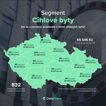 Sektor cihlových bytů zaznamenal v červenci 832 transakcí a v rámci realitního trhu v celé republice byl nejméně aktivním sektorem. Nejvíce prodejů evidovalo hlavní město Praha, po něm pak Jihomoravský a Středočeský kraj. V rámci Prahy proběhlo v sektoru cihlových bytů 204 transakcí, v Jihomoravském kraji 90 transakcí a ve Středočeském kraji 82 transakcí.