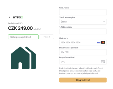 Základní tarif vám umožňuje provést pouze 2 ocenění nemovitosti za měsíc. Přejděte na tarif PRO nebo INVEST a sledujte v HYPOXu pohodlně celé své portfolio a díky pokročilým funkcím analyzujte trh a hledejte další příležitosti.