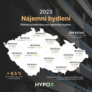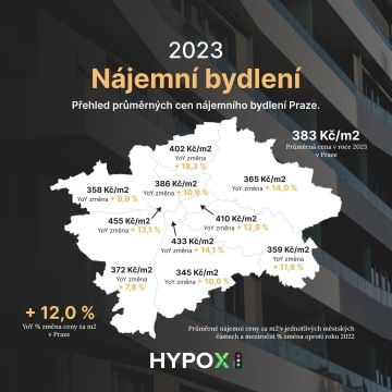 V roce 2023 průměrný nájem v Praze podražil o 12 % na průměrných 383 Kč/m2. Průměrná cena v rámci celé republiky vychází v loňském roce přibližně o sto korun levněji, na 286 Kč/m2, i tak šlo ale o meziroční cenový nárůst o 8,5 %.
